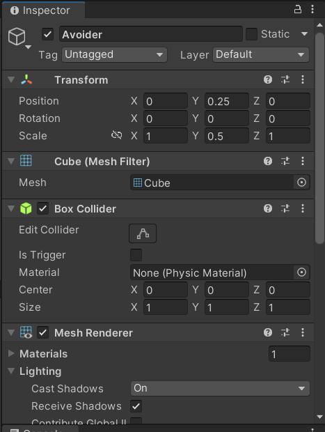 Cube 오브젝트로 플레이어나 Wall을 생성했기 때문에 컴포넌트로 박스 콜라이더가 들어있다.