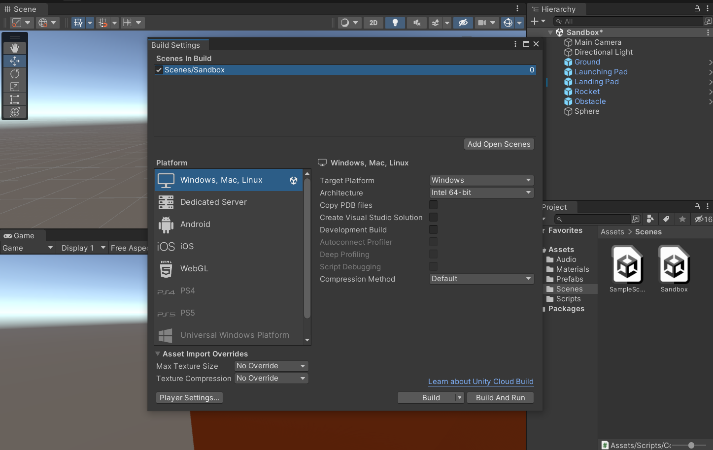 - 씬은 Add Open Scenes를 눌러 현재 켜져있는 씬을 추가하거나 드래그 앤 드롭으로 에셋폴더에 있는 씬을 Scenes In Build에 가져다 넣어서 추가하면 된다.