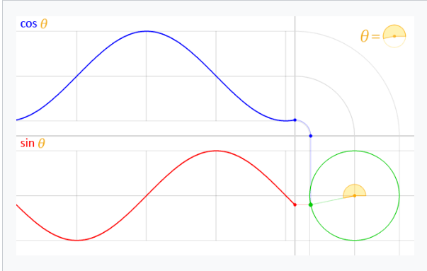 Sin은 펜으로 나무디스크를 돌 때 균일한 속도로 종이가 움직이며 생긴 파형처럼 생성된다.