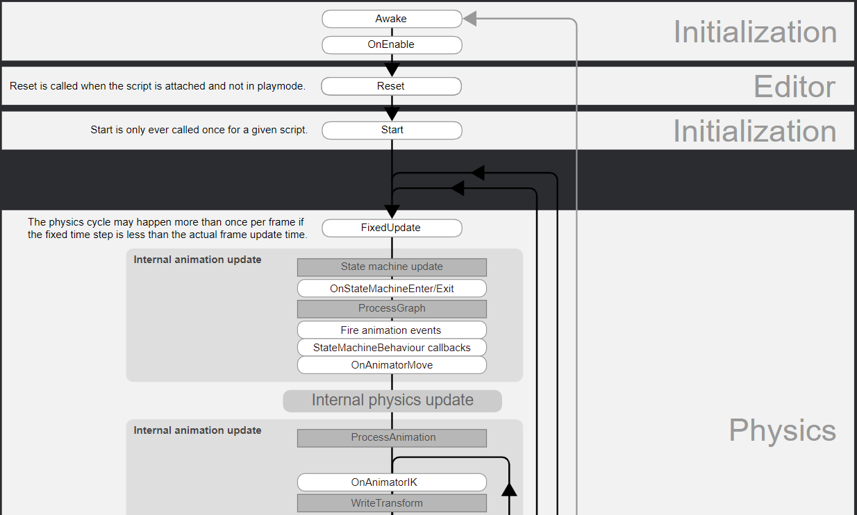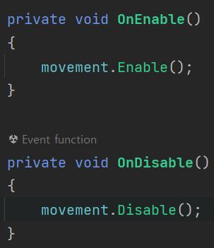 - 유니티가 플레이 버튼이 눌렸을 때 Awake에서 찾을 수 있는 모든 스크립트에 일어나라고 명령하고 그 다음에 OnEnable이 호출되어 안에 들어있는 것들을 활성화 시킨다. ** OnDisable도 써줘야함 (비활성화를 위해)