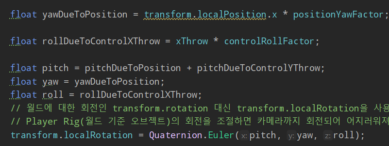 YawDueToPosition도 위와 같은 이유인 position과 연동되기 때문에 localPosition.x을 사용하였고(양 옆 이동)