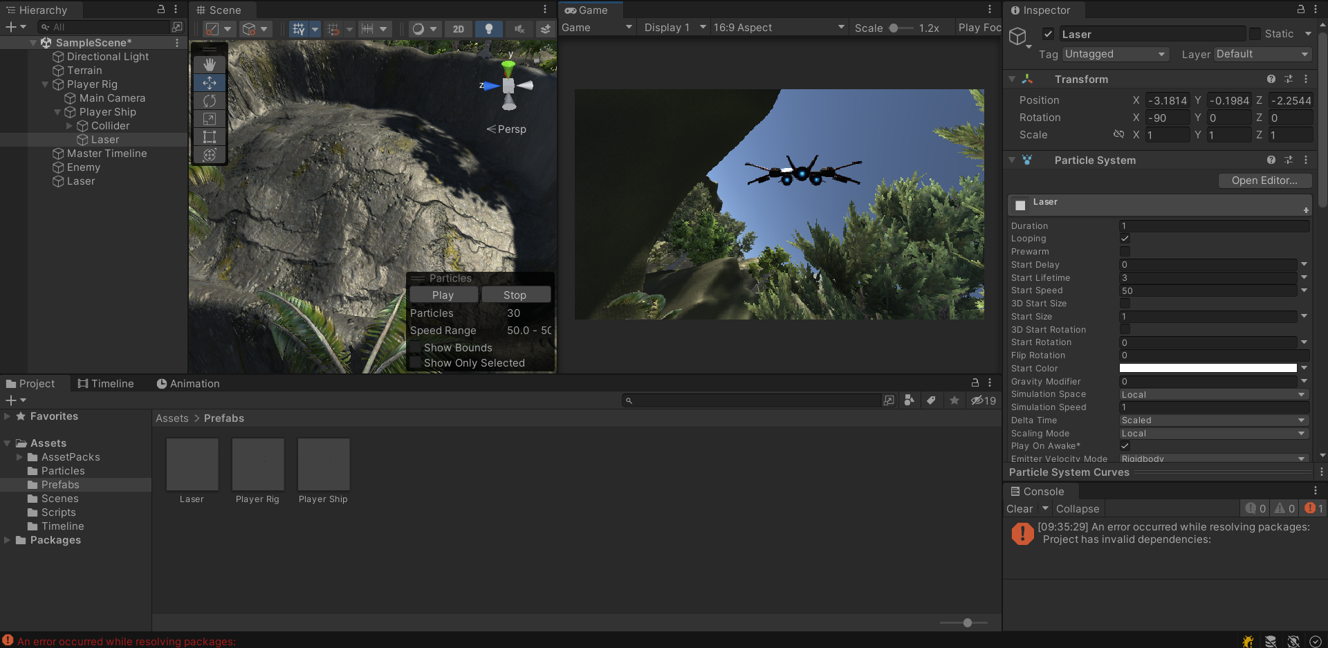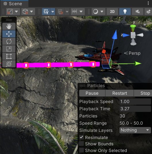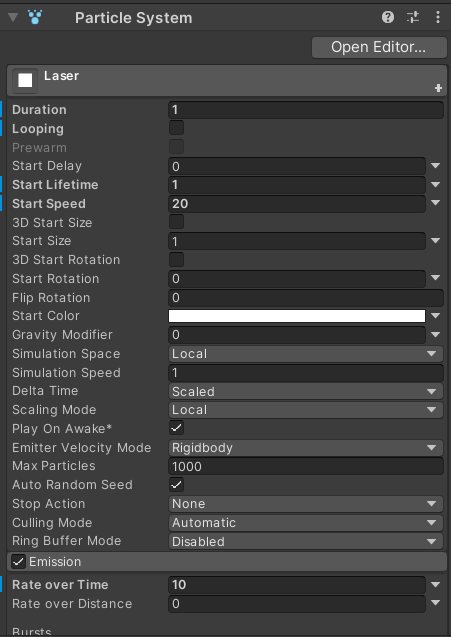 발사된 레이저 파티클이 함선을 따라다니는데 레이저 파티클은 따로 있게 하려면 Simulation Space를 Local에서 World로 바꿔주면 된다.