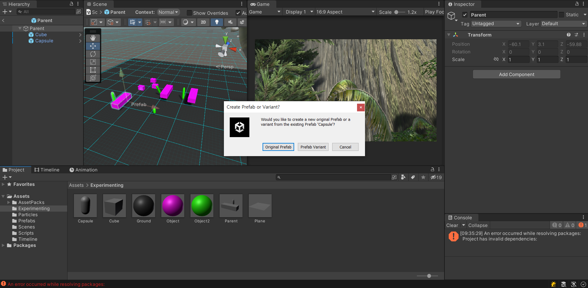 캡슐을 변형하고 프로젝트 창으로 드래그 앤 드롭을 하여 Original Prefab을 만들었을 때 이전에 있던 원본 프리펩을 삭제해도 원본 인스턴스는 씬에 남아있다.