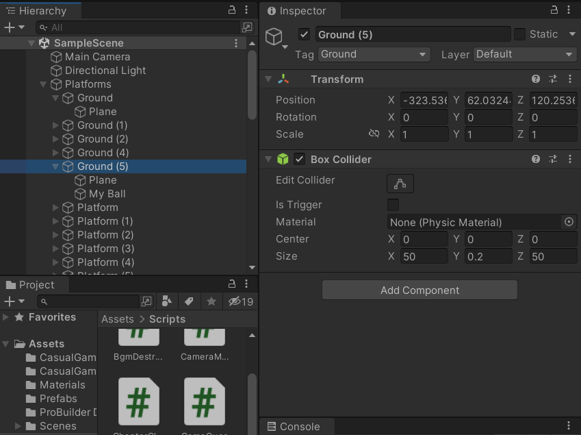 1. 플랫폼의 부모(Ground) scale은 (1, 1, 1)로 고정시키고 Collider를 키우고 싶은 크기만큼 늘린다.