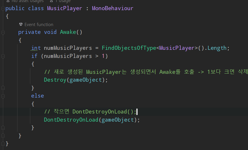 씬에 MusicPlayer타입을 다 찾고 그 갯수가 1보다 크면 삭제하고 1보다 작다면 DontDestroyOnLoad로 파괴되지 않게 한다. - 특정 유일 오브젝트가 계속 씬에 존재함