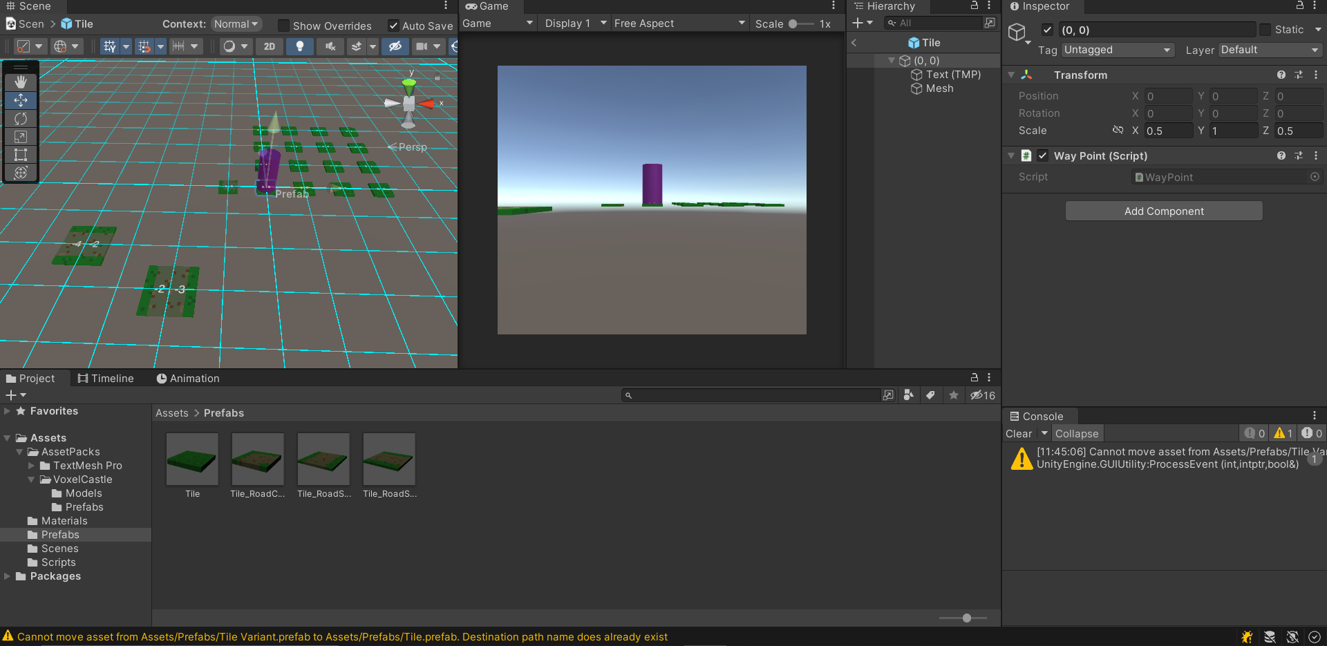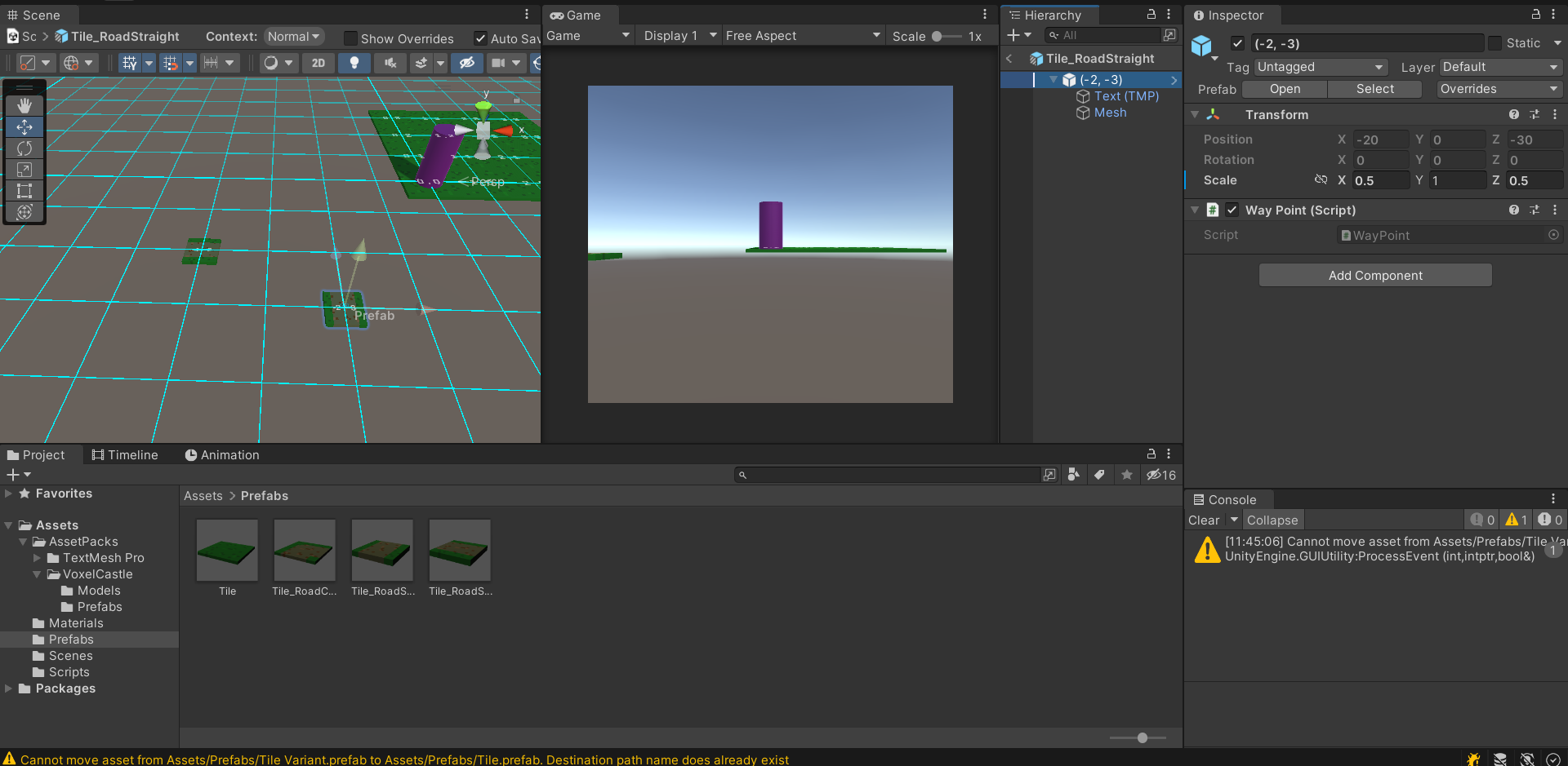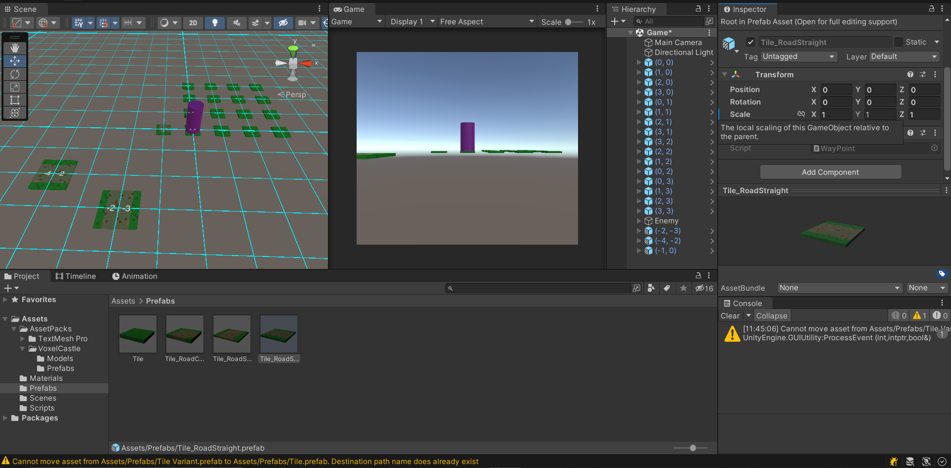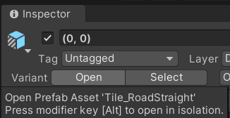 Tile 프리펩을 수정하면 Tile 프리펩의 Variant인 Tile_RoadStraight도 변경사항이 적용되게 된다.(둘은 연결되어 있음)