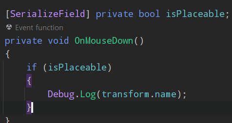 설치가 가능한 타일만 선택이 가능하도록 만들기 위해 SerializeFile bool 변수를 선언해서 isPlaceable이 true일 때만 출력하게 하고