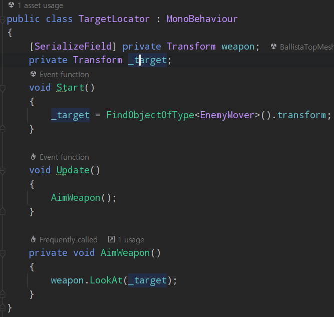 타겟의 transform을 FindObjectOfType<EnemyMover>으로 받아오고(EnemyMover가 우리의 타겟의 개체니까)