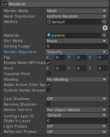 RenderAlignment를 Velocity로 바꾸어 메시가 이동하는 방향으로 보이게 만든다.