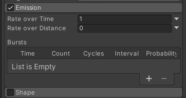 Shape는 끄고 Emission의 Rate over Time을 1로 만들고