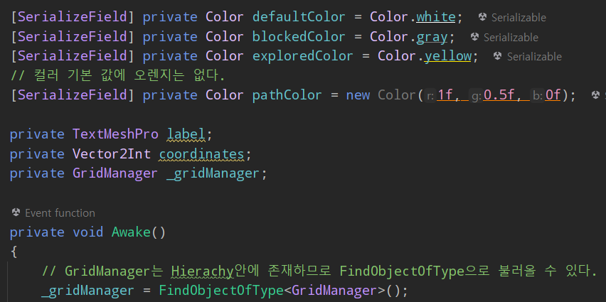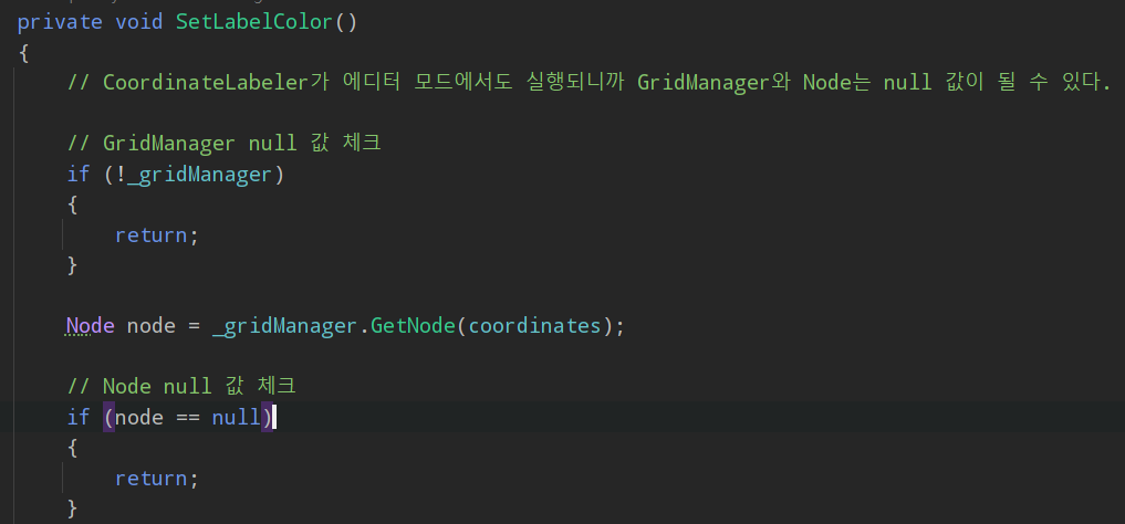 색을 칠할 때 GridManager와 Node의 값이 null이면 return하게 했다. (Coordinate 클래스가 에디터 모드에서도 실행되므로 nullReference오류가 에디터 모드에서 뜸)