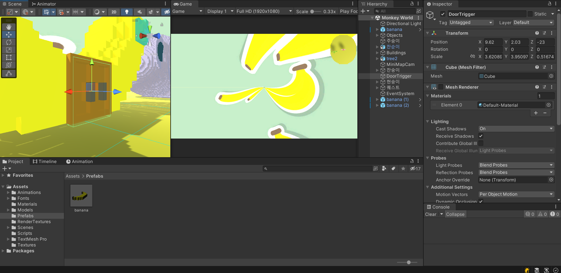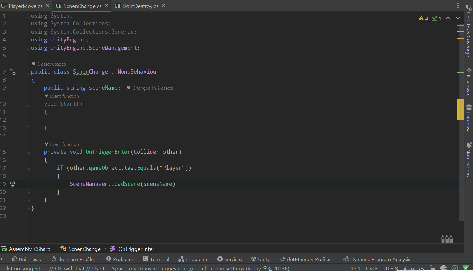 문 방향에 Collider를 붙이고 Trigger를 체크하여 Tag가 Player면 씬을 이동할 수 있다는 것을 배웠다. - public string으로 씬 이름을 문자열로 받아 각 트리거마다 다른 씬으로 이동할 수 있게 만들 수 있다는 것을 배웠다.
