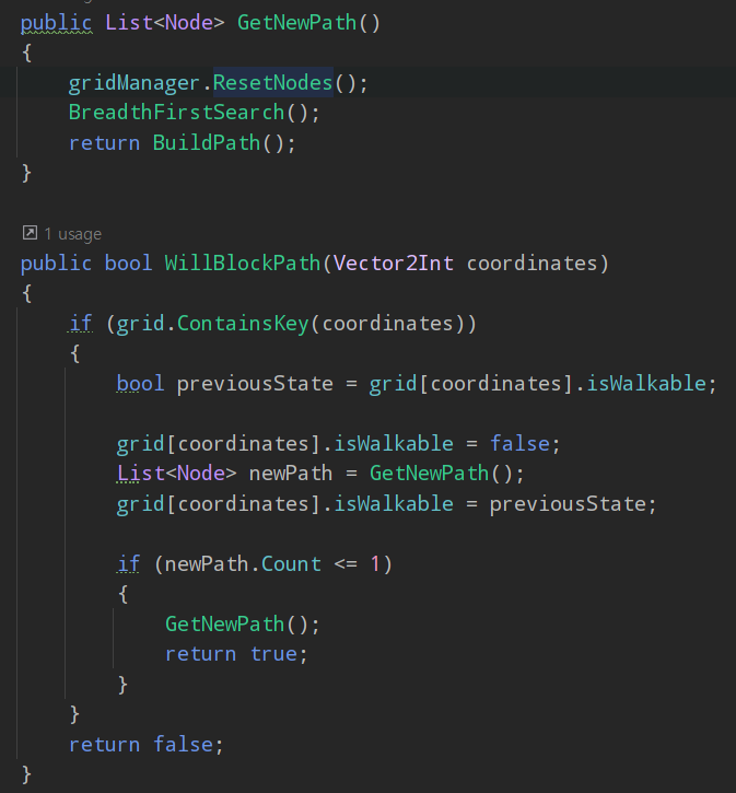 WillBlockPath는 grid 좌표의 이전 상태 변수를 생성하여 isWakable을 대입하고 grid의 isWalkable은 false로 만든다. 이후 GetNewPath를 호출하고 newPath리스트에 대입하고 grid의 isWalkable을 previousState(무조건 true지만 안전장치)로 정한다.