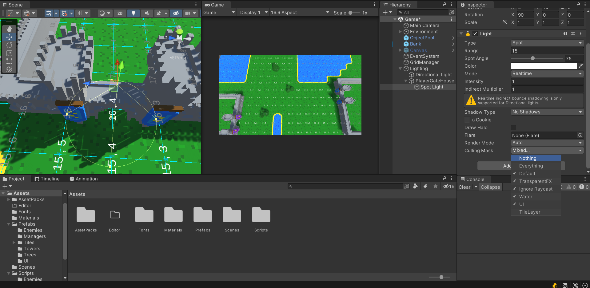 아래의 Culling Mask 옵션을 통해 특정 Layer를 비추지 않게 함으로써 이것을 해결할 수 있다.