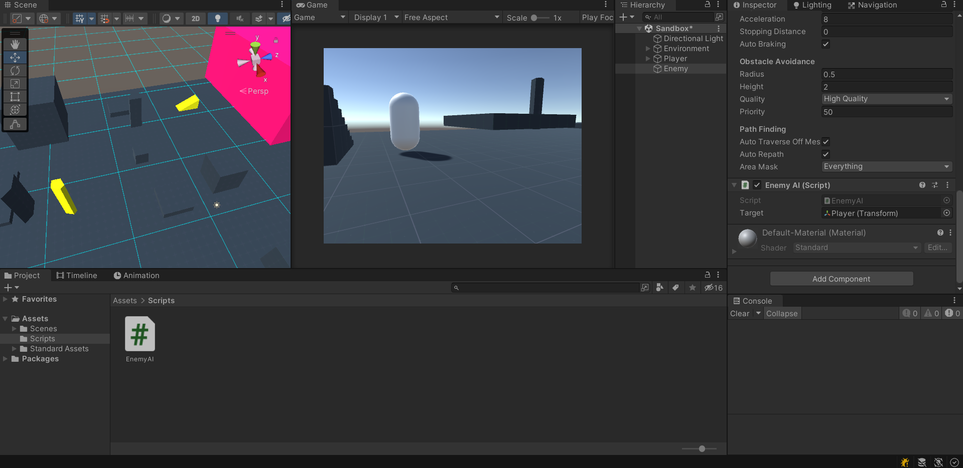 NavMeshAgent를 쓰기 위해 Using UnityEngine.AI를 적어주고 NavMeshAgent의 SetDestination 함수를 사용하였다.