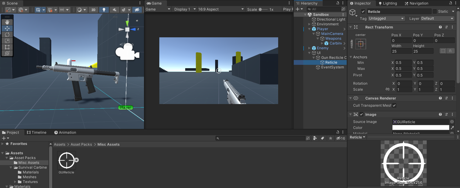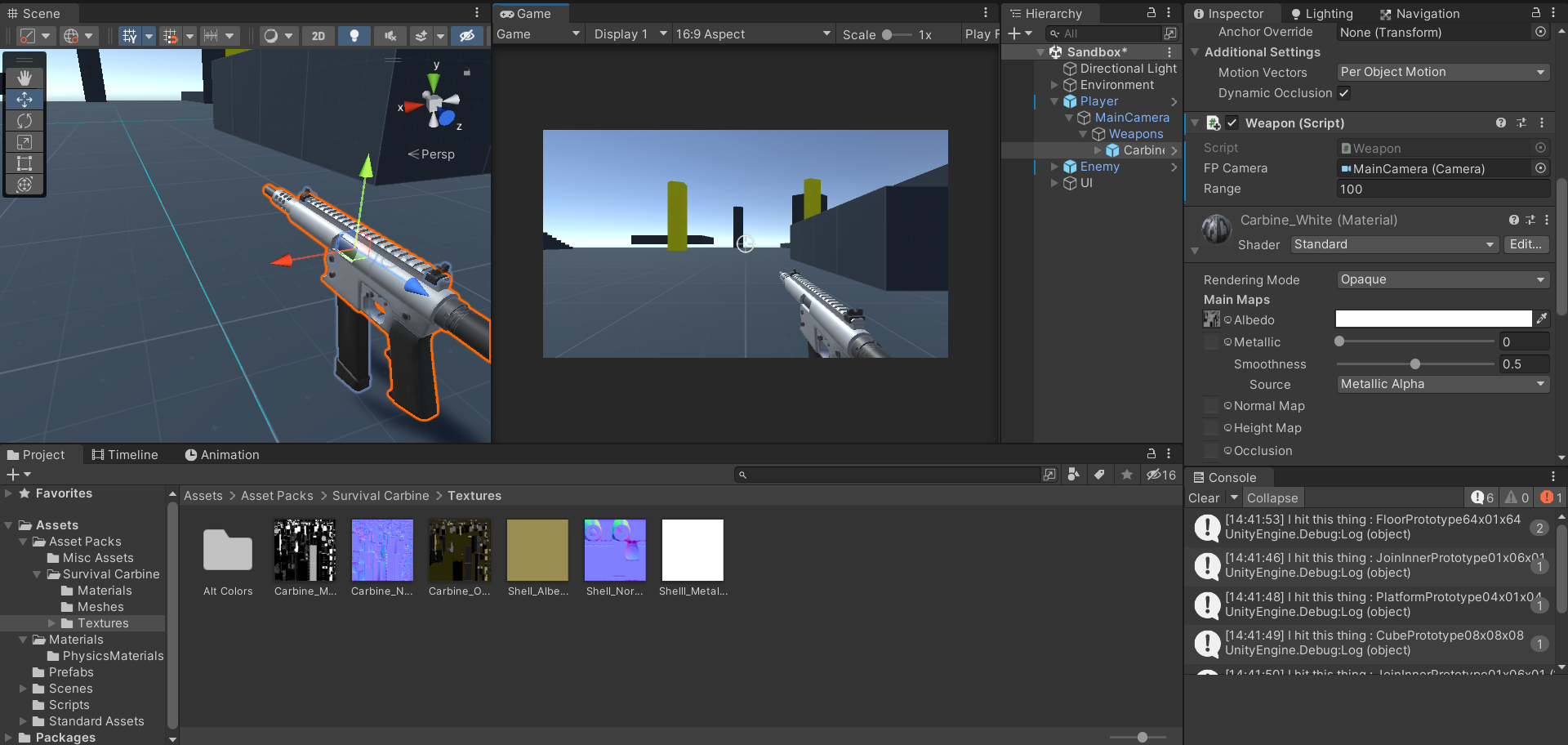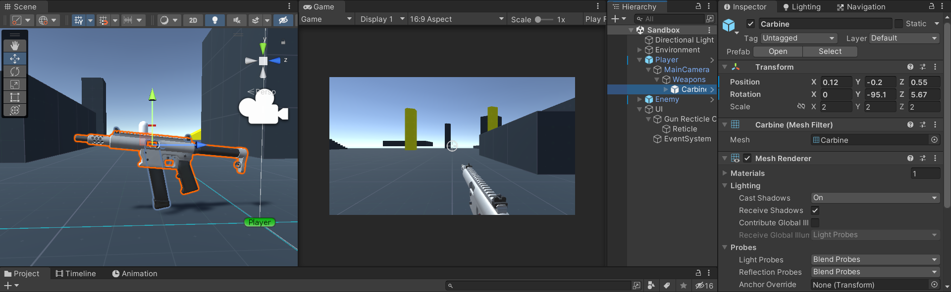 플레이어 카메라 아래에 총 프리펩을 넣고 적절한 위치로 배치했다.