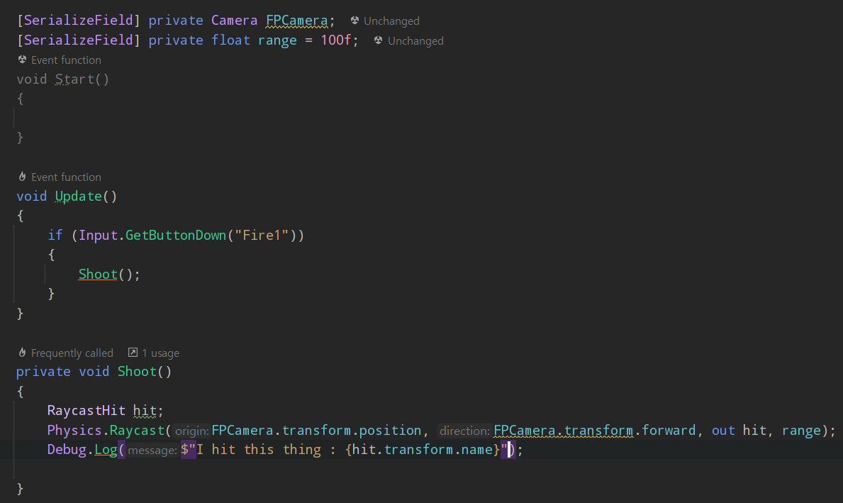 마우스 왼쪽 클릭을 했을 때 카메라의 위치로부터 카메라의 forward(정면)방향으로 range만큼 쏴서 맞으면 hit에 정보를 저장한다.