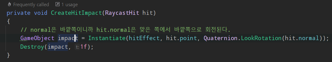 CreateHitImpact에선 hit의 정보를 받아서 파티클을 생성하는데 hit.point(맞은 위치)와 Quaternion.LookRotation을 사용하여 맞은 위치에서의 회전 값 normal(바깥 방향)을 바라보고 생성되게 하였다.