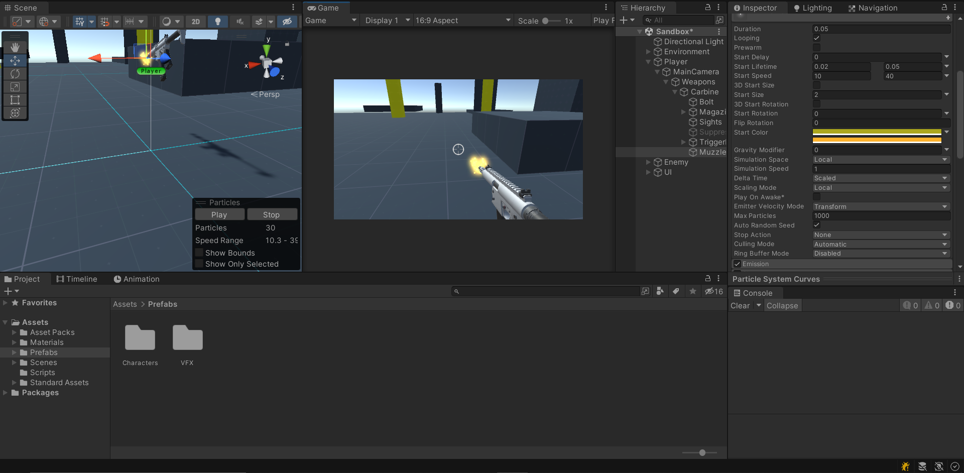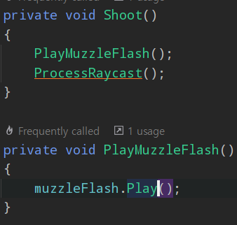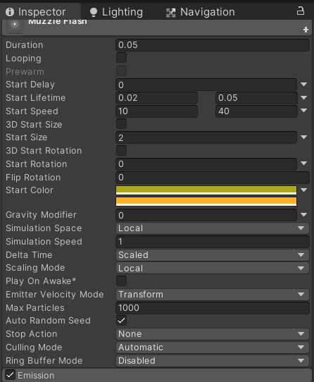 파티클 시스템에서 PlayOnAwake를 끄고 스크립트에서 Shoot 메서드가 불렸을 때 파티클 시스템을 Play를 하여 쏠 때마다 Play되게 하였다.