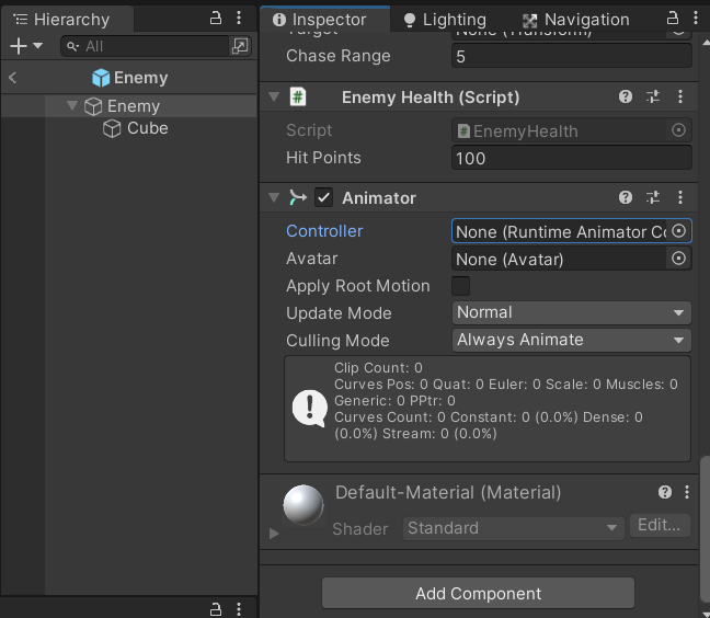 이전에 추가한 애니메이터 컴포넌트에 애니메이터 컨트롤러를 추가하고