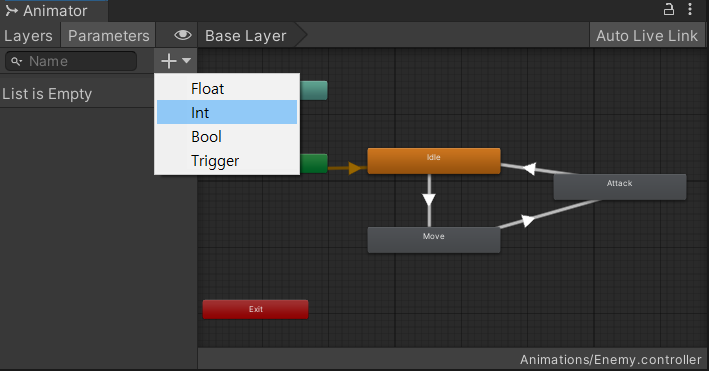 애니메이터에는 트랜지션의 Conditions(조건)과 관련있는 변수를 설정할 수 있는데 그것이 Parameters이다.