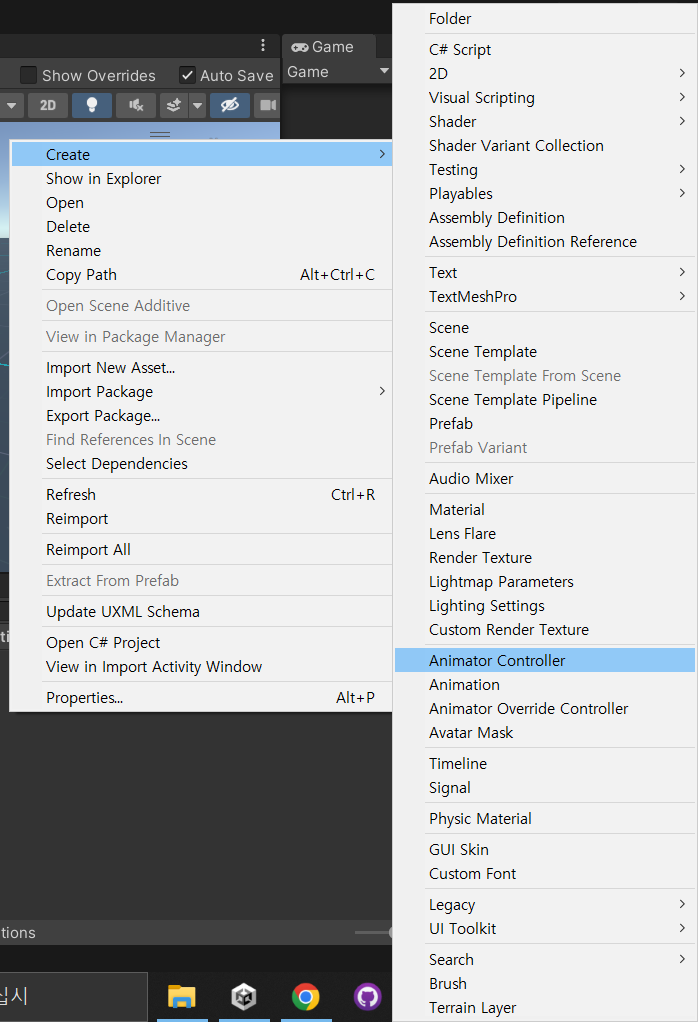 프로젝트에 우클릭하여 Create - Animator Controller를 생성한다.