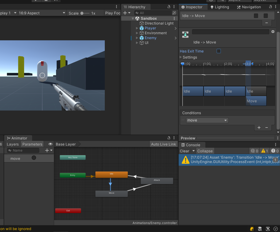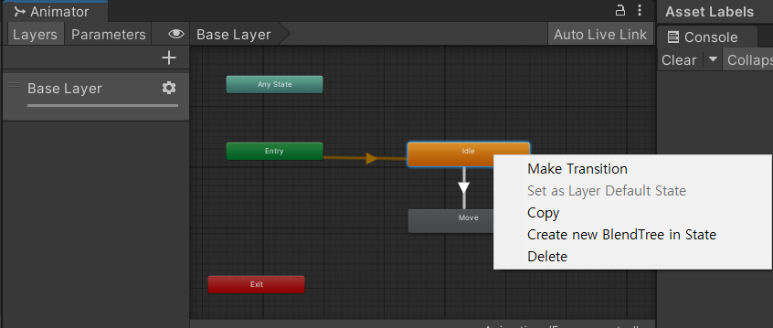 추가한 애니메이션을 우클릭하면 Make Transition으로 화살표 모양인 트랜지션을 만들어서 다른 애니메이션에 연결할 수 있는데