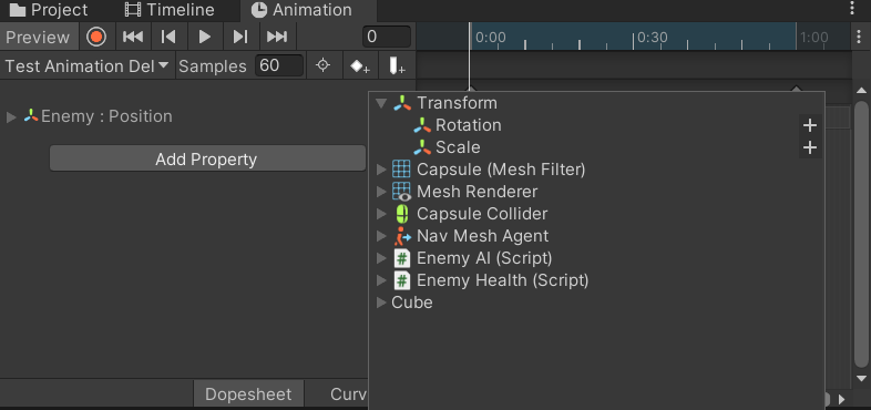 이후 하이러키의 애니메이터와 애니메이션이 있는 게임 오브젝트를 선택하면 Add Property가 활성화 된다.