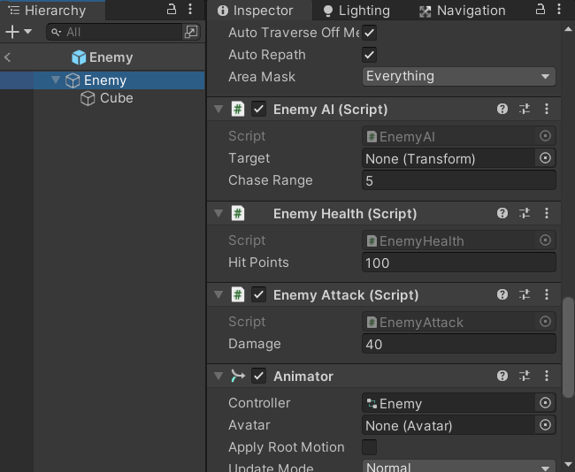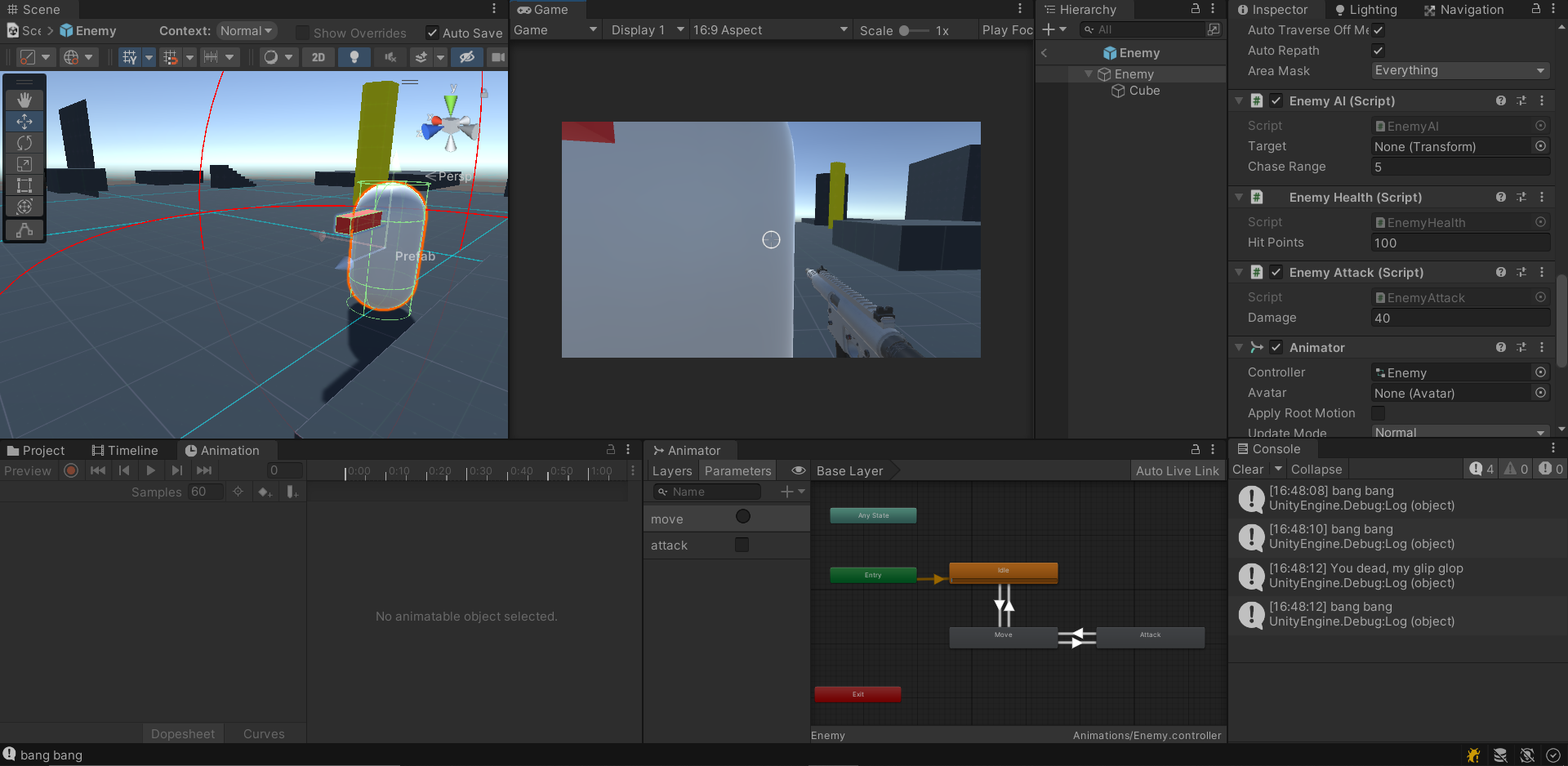 그래서 PlayerHealth를 FindObjectOfType으로 받아 애니메이션 Event에 등록된 함수인 AttackHitEvent에서 target으로 받은 PlayerHealth의 TakeDamage를 호출하는 방식을 사용하였다.