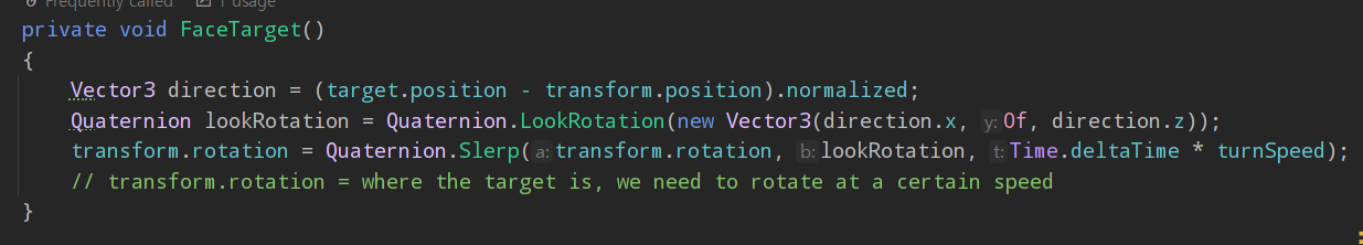 먼저 방향을 정해주기 위해 타겟 포지션에서 현재 포지션을 빼주고 normalized 시켰다. (현재 포지션 -> 타겟 포지션 방향)