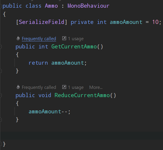 Ammo라는 클래스를 만들어 총알은 10발로 하고 현재 총알을 가져오는 함수와 총알 갯수를 줄이는 함수를 만들었다.
