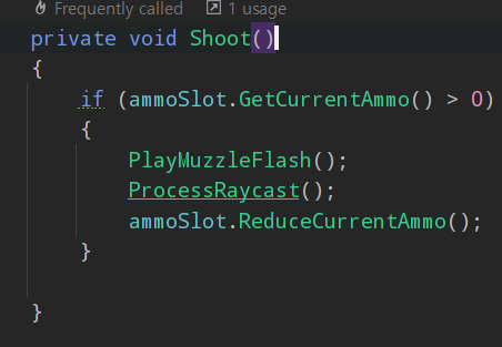 이후 Weapon 클래스에서 총알을 쐈을 때 총알 갯수가 0개보다 커야 AmmoSlot의 ReduceCurrentAmmo를 호출하게 했다.