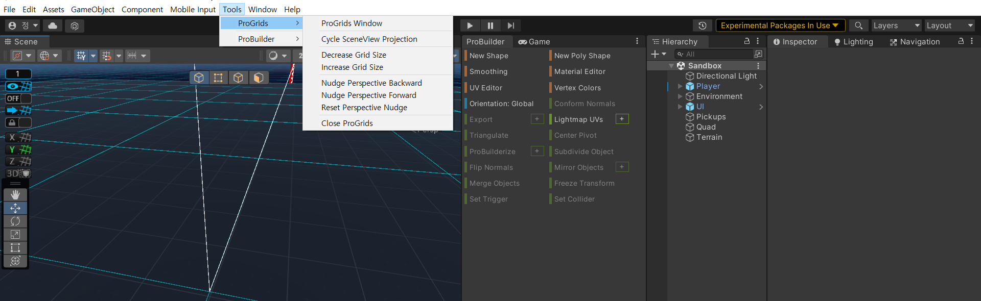 Progrids를 켠 상태로 ProBuilder의 New Poly Shape를 통해 자신만의 폴리곤을 만들 수 있다.