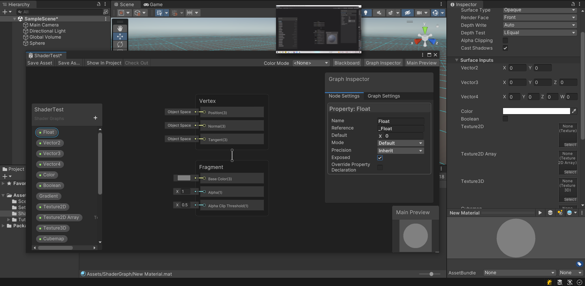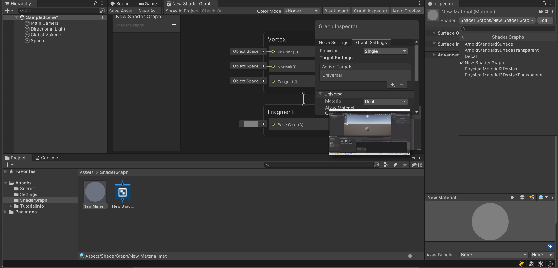 쉐이더 그래프를 생성하여 Material을 생성하여 Shader의 Shader Graphs에서 생성한 쉐이더 그래프를 선택할 수 있다.