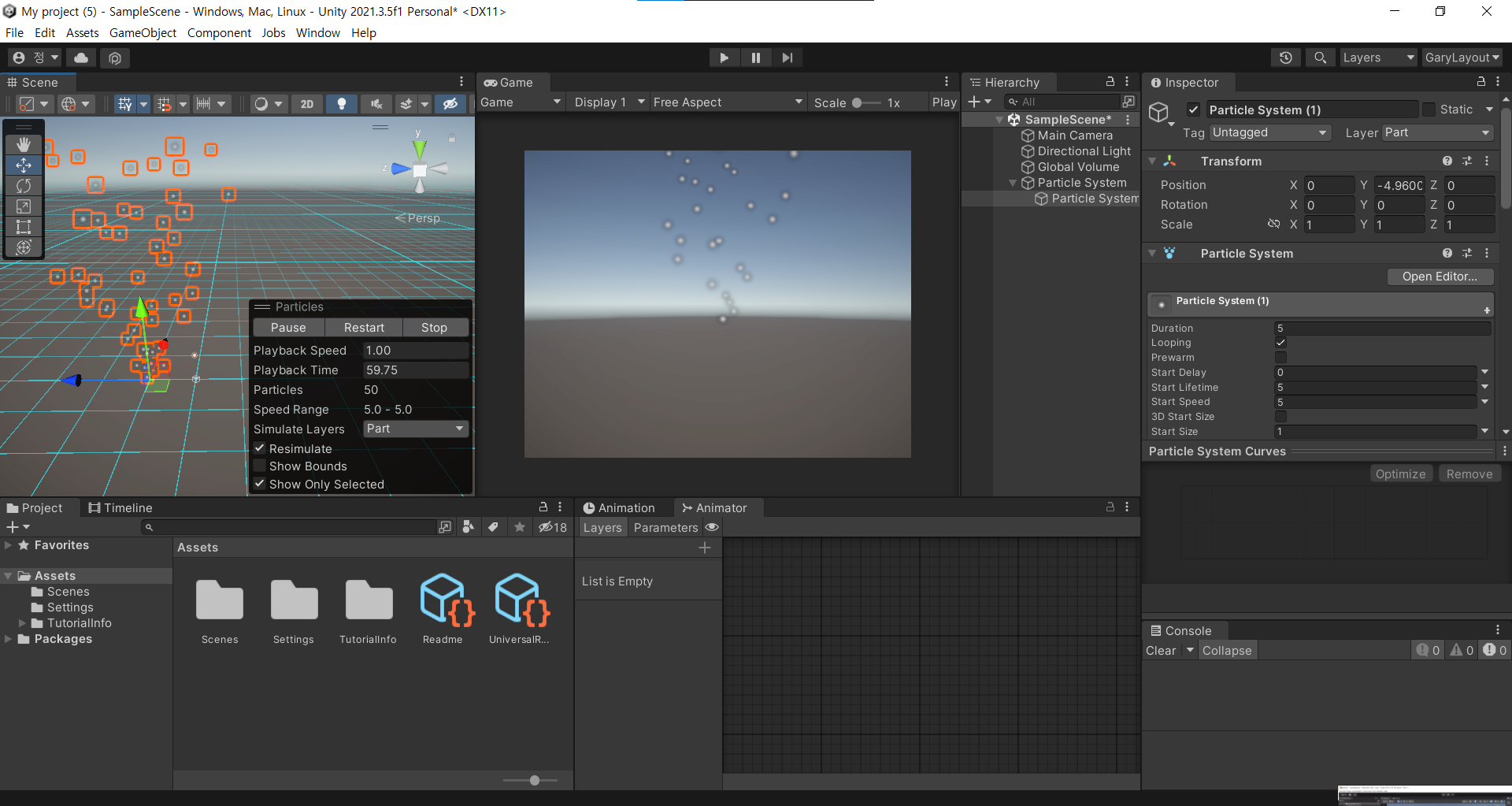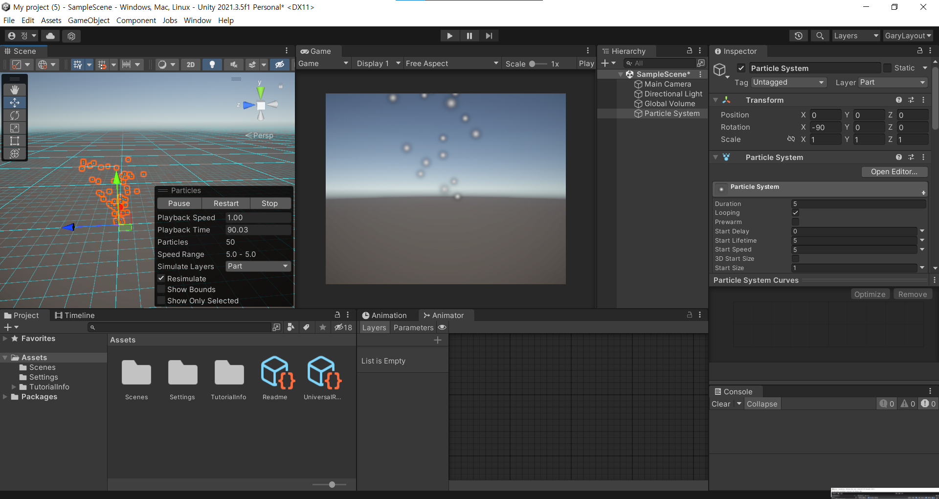 Particle System 컴포넌트는 씬 안에 다수의 작은 2D 이미지를 생성하고 애니메이션하여 액체, 구름 및 불꽃 같은 유체 엔티티를 시뮬레이션합니다. 파티클 시스템과 그 용도에 대한 전체 개요는 파