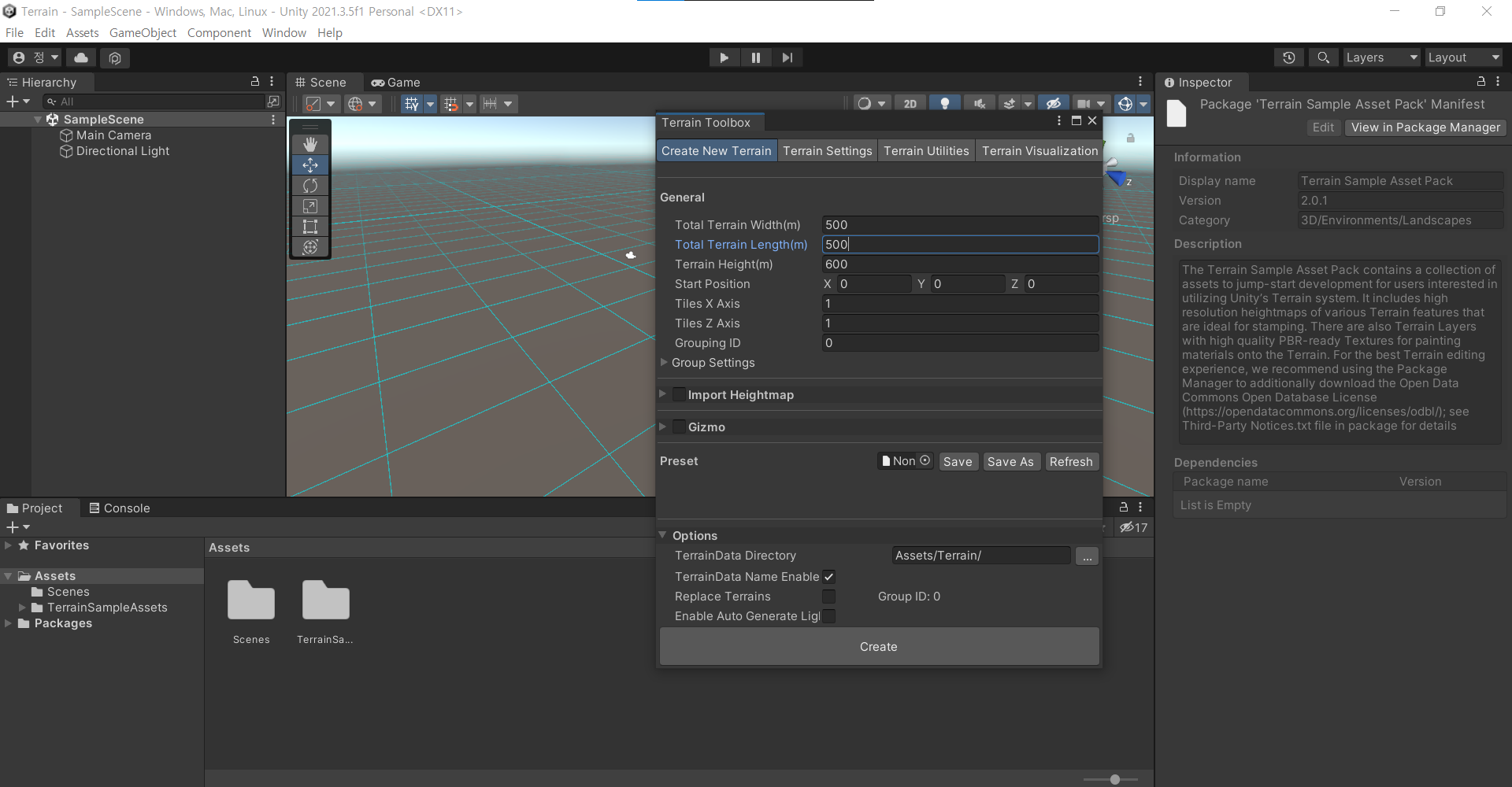 Window - Terrain - Terrain Toolbox의 Create로 Terrain 생성이 가능하다.