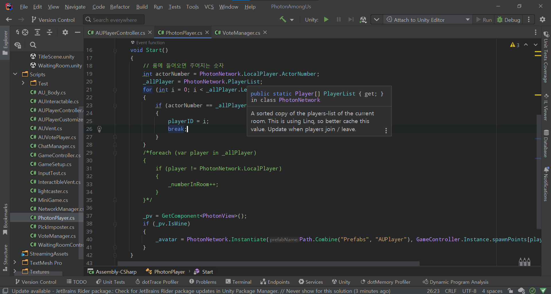 이번 주는 벤트와 투표를 구현해보는 시간을 가졌다. 포톤 중 플레이어에 대해서 관리하는 법을 많이 다뤘던 것 같다.