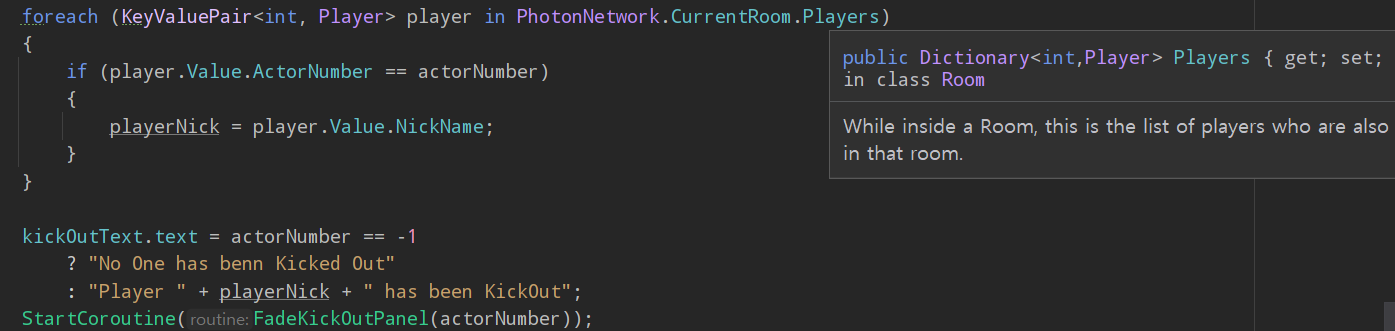 PhotonNetwork.CurrentRoom.Players가 딕셔너리인 것을 이용하여 foreach문을 돌면서 딕셔너리의 Value인 Player의 ActorNumber마다 해당 actorNumber를 비교하여 같으면 플레이어의 닉네임을 넣어주는 로직이다.