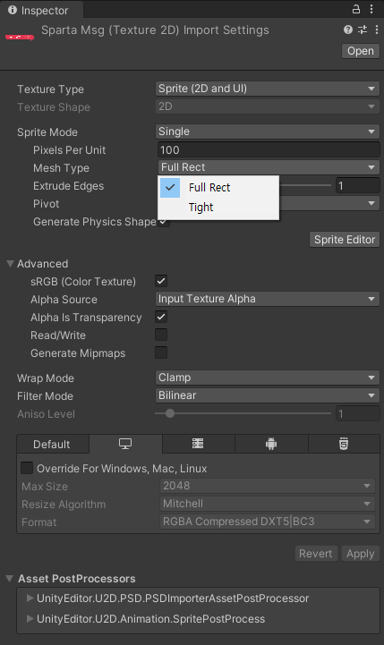 로고 이미지는 짤리는 경우가 있어 Mesh Type을 Full Rect로 해주면 좋다.