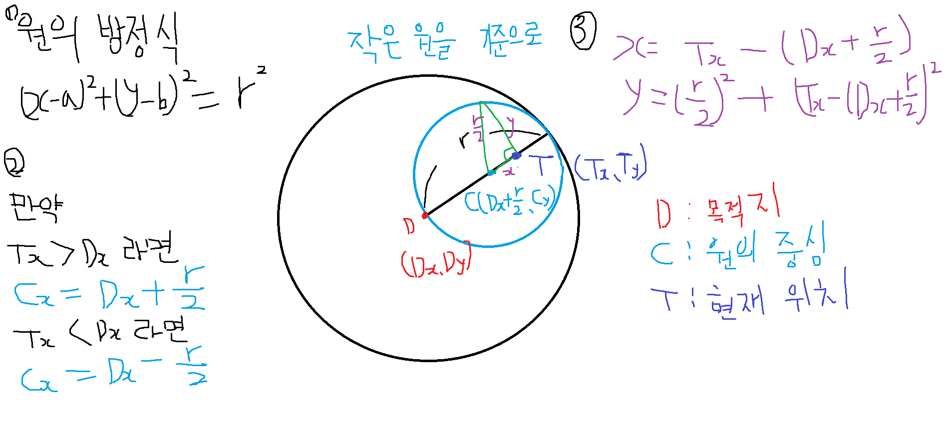 // 현재 위치에서 목표지점까지의 선분(원의 지름) 위의 점 + 원 중심으로부터 y좌표