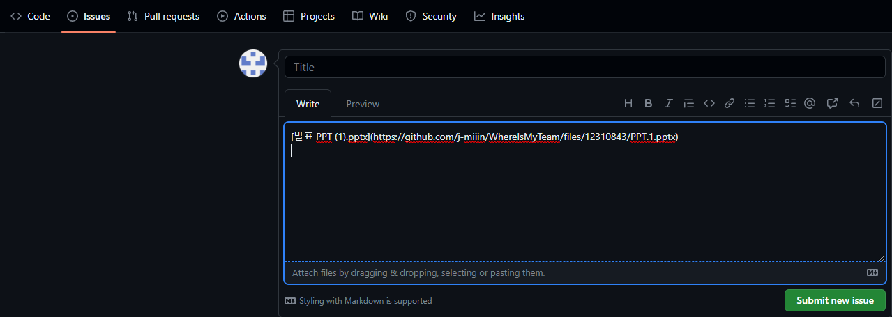 약간의 트릭을 이용해 편리하게 Github Readme에 이미지를 삽입할 수 있다. 1. Github 프로젝트의 Issue 탭으로 들어간다. 2. New Issue 버튼을 눌러 이슈 추가 화면으로 들어간다. 3. 업로드하고자 하는 이