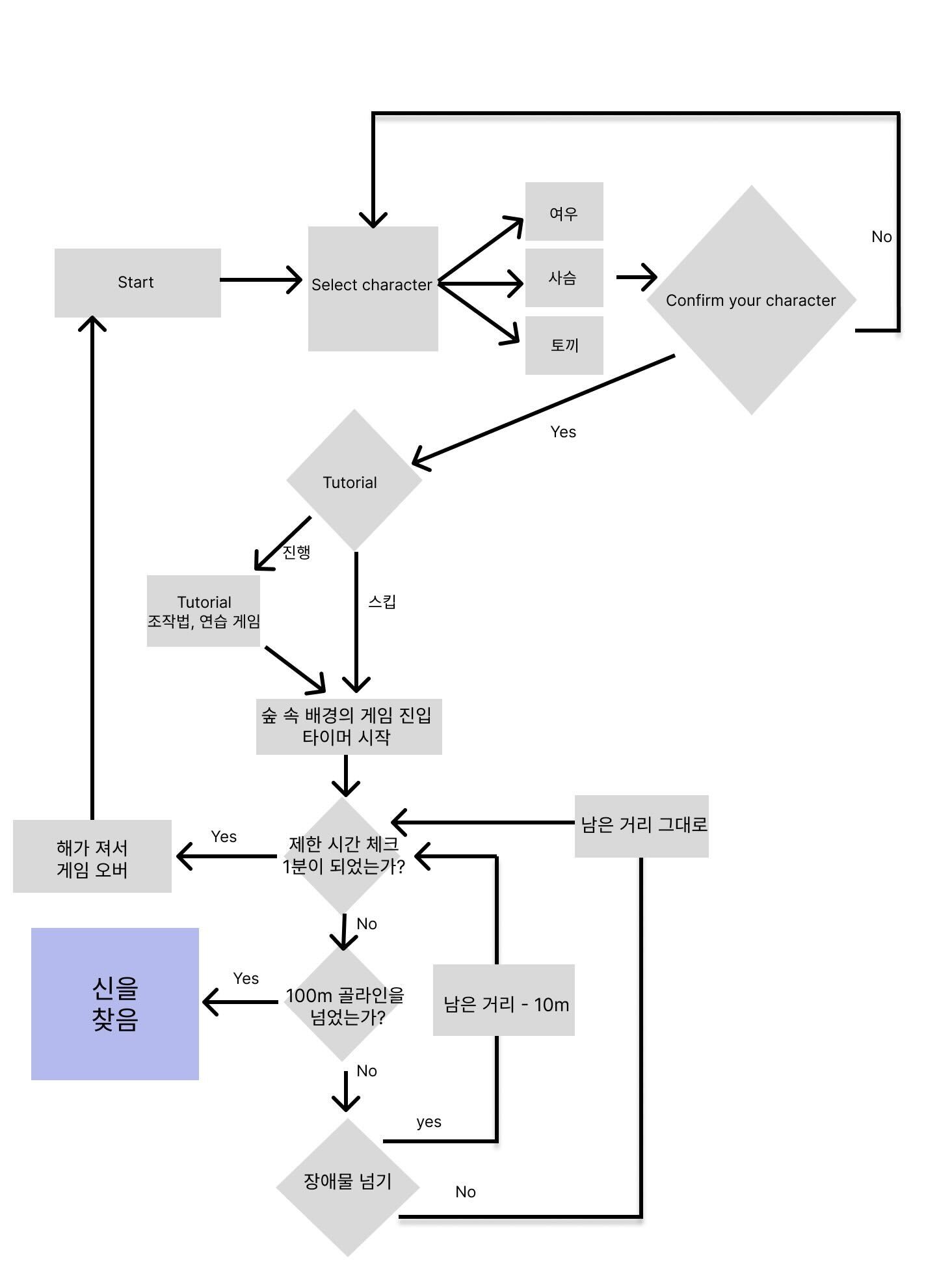 플랫폼형 게임으로 동물 캐릭터를 선택하여 제한시간 내에 장애물을 피하고 100m 골라인을 넘으면 신을 찾는 게임의 플로우 차트이다.