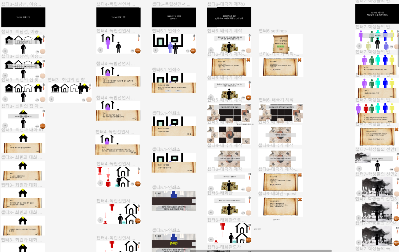 우리조는 지난 주부터 마지막 결과물까지 오면서 기획 방향을 총 4번정도 바꿨던 것 같다. 처음 아이디어는 재난 상황에 대피하는 안전교육이었다가 한국사 교육으로 바뀌고 또 한국사 교육 내에서도 스토리 모드로 표현하여 시뮬레이션 형식으로 하다가 퍼즐 게임을 메인으로 역사 교육을 하는 것으로 바꾸고 또 스토리 모드와 퍼즐을 합쳤다가 마지막엔 각 챕터별로 퀘스트를 진행하고 그 퀘스트 안에 미니게임을 만들어서 각 챕터 진행 후에는 역사적 사실을 알려주는 방식으로 바뀌었다. 글만 봐도 어지럽고 무슨 말인지 이해가 어려운 만큼 다사다난 했던 것 같다. 조원 간의 의견 대립이 있었는데 그것을 조율하고 또 다시 아이디어를 내는 과정이 꽤나 재밌었다. 결과물이 어느정도 만들어지는 게 보여서 끝까지 마무리 할 수 있었다. 이번에 의견 대립이 있을 때 그냥 말로 표현하는 식으로 내 주장을 펼쳤는데 다음 번엔 각 입장의 예시를 찾아서 비교하여 우리 과제에서 어떤 식으로 표현하는 게 좋은 지 상의하는 식으로 해봐야겠다.