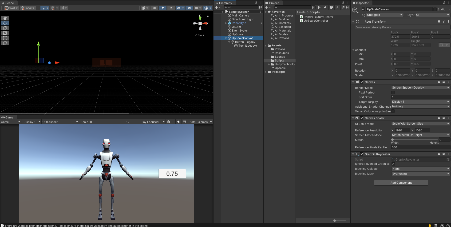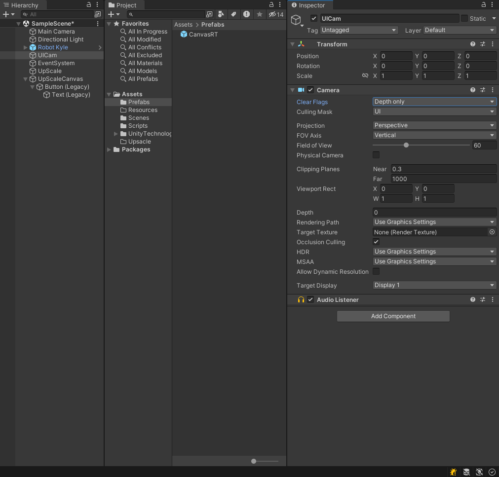 4-1. 중요한 점은 업스케일링할 Canvas(만들어놓은 프리펩)의 Sort Order가 버튼 UI의 Sort Order보다 높아야한다. => 그래야 보임