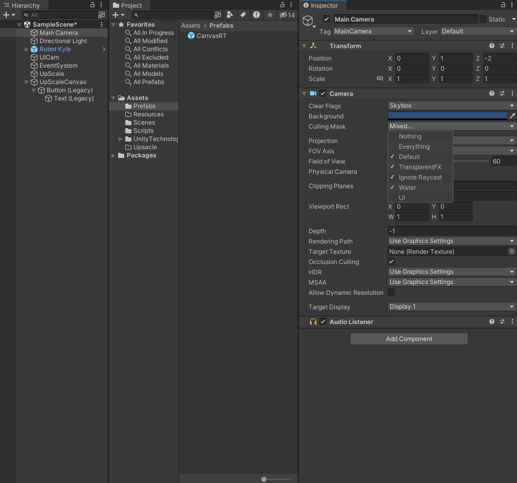 1-1 CullingMask 옵션에서 UI카메라는 UI만 찍게하고 메인 카메라는 UI를 제외한 부분을 찍게한다.
