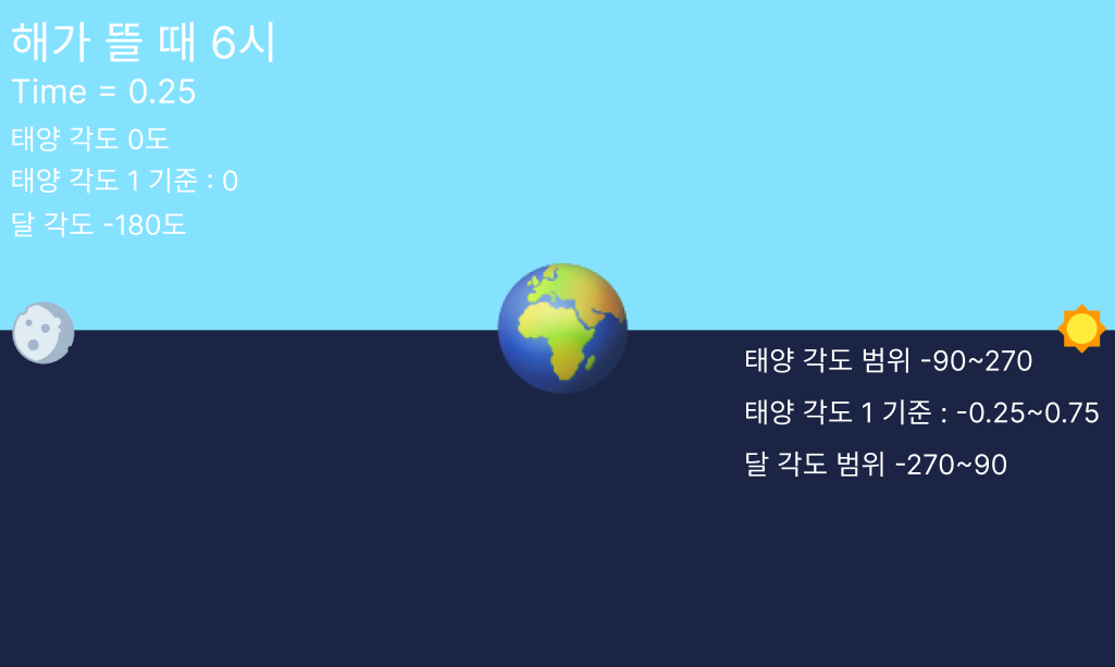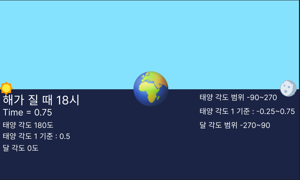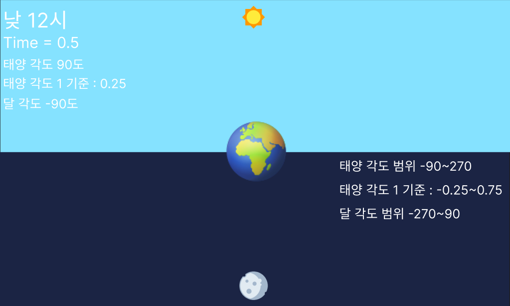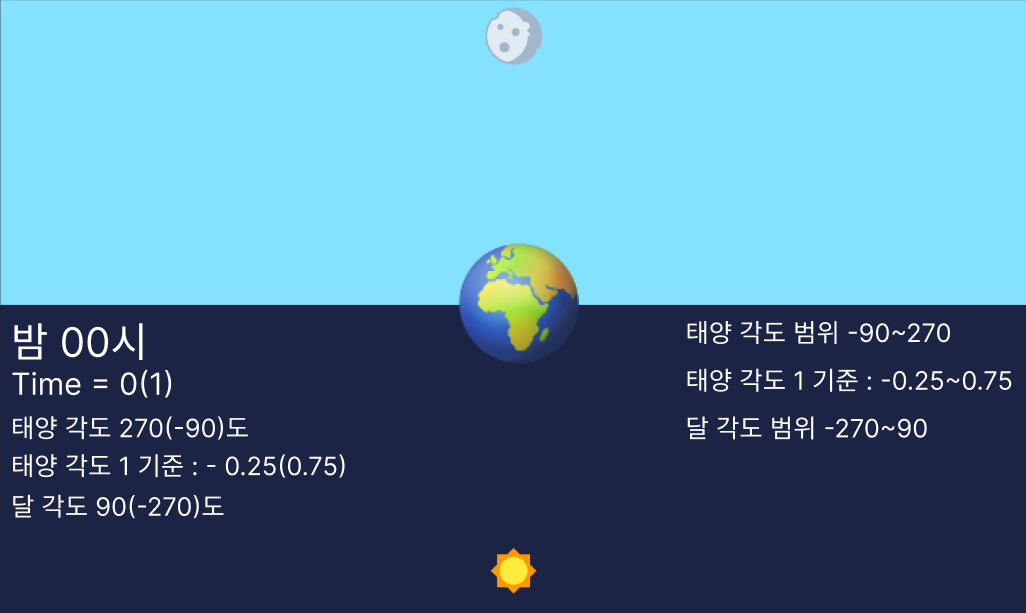 해가 뜰 때 기준으로 6시니 time은 0.25겠고 lightSource가 sun이니 0.25f - 0.25f == 0이니까 각도가 0으로 나오게 된다.