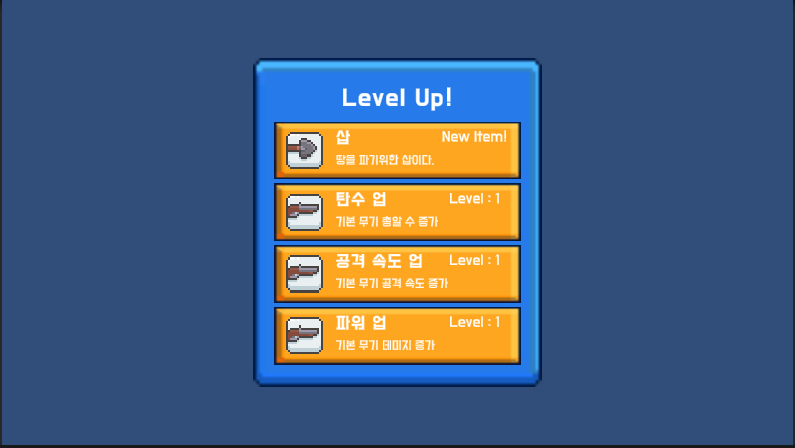 오늘은 무기 데이터 구현과 UI 연결을 진행했다. 아직 실제 데이터가 적용(캐릭터의 투사체에 데이터 적용)은 되지 않았지만 내일 실제 데이터와 연결할 생각이다. 그리고 이후에는 각 무기 별로 발사되는 로직을 구현하도록 할 생각이다. 오늘 캐릭터와 연결하는 부분을 고민을 많이 해서 시간이 오래 걸렸지만 그래도 내일 어떻게 구현해야할지 답이 좀 나온 것 같아서 다행이다.
