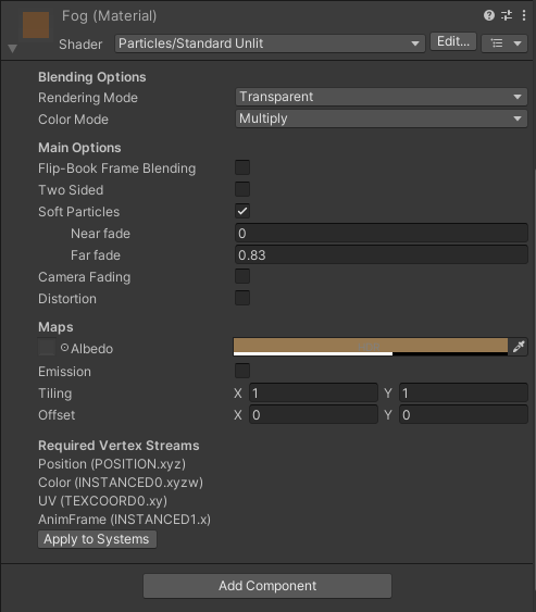 4. Albedo값을 원하는 색과 알파 값을 정해주면 간단한 Fog Material이 만들어진다.