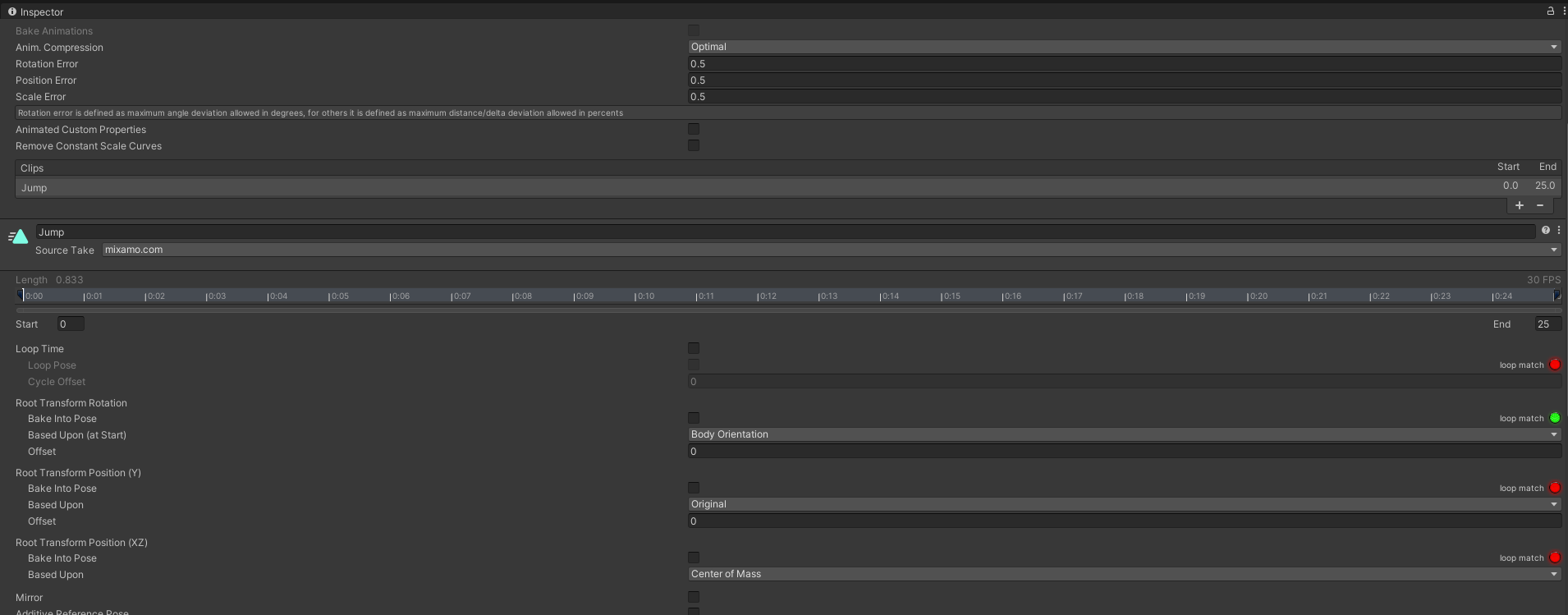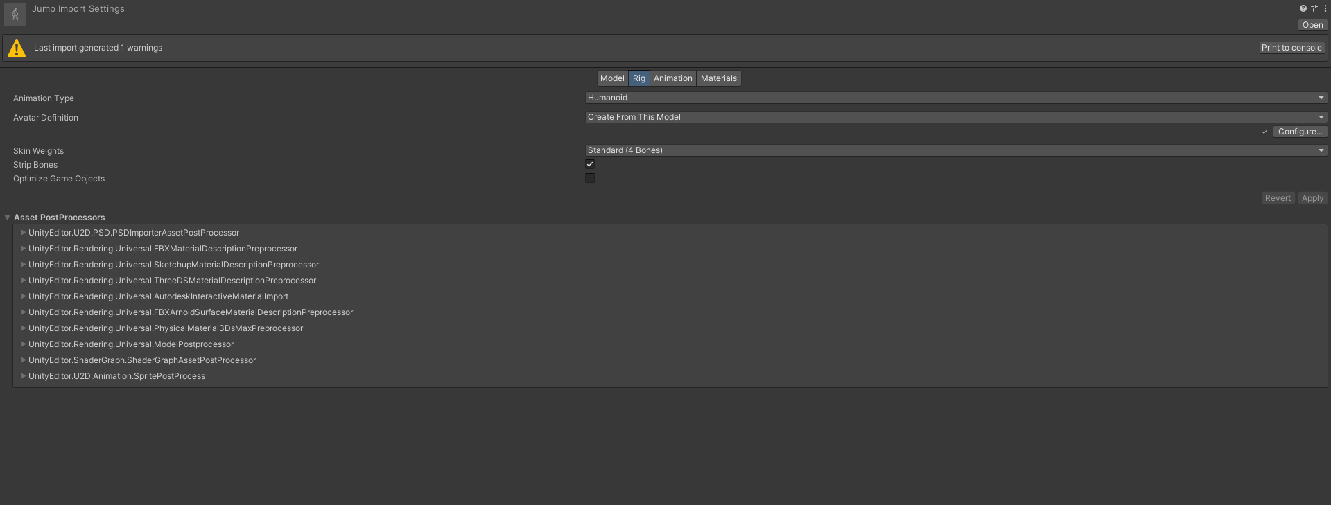 이슈 : Mixamo에서 가져온 Animation에서 humanoid로 변경 후 Import Message Warning이 뜸