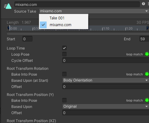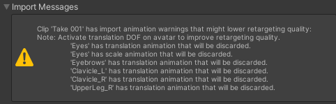 시도한 것 : 'Take001'이라는 애니메이션이 문제여서 Animation 탭의 Clips에서 제거함, 그러나 왜인지 Source Take 부분에는 남아 있고 Import Message Warning도 존재함